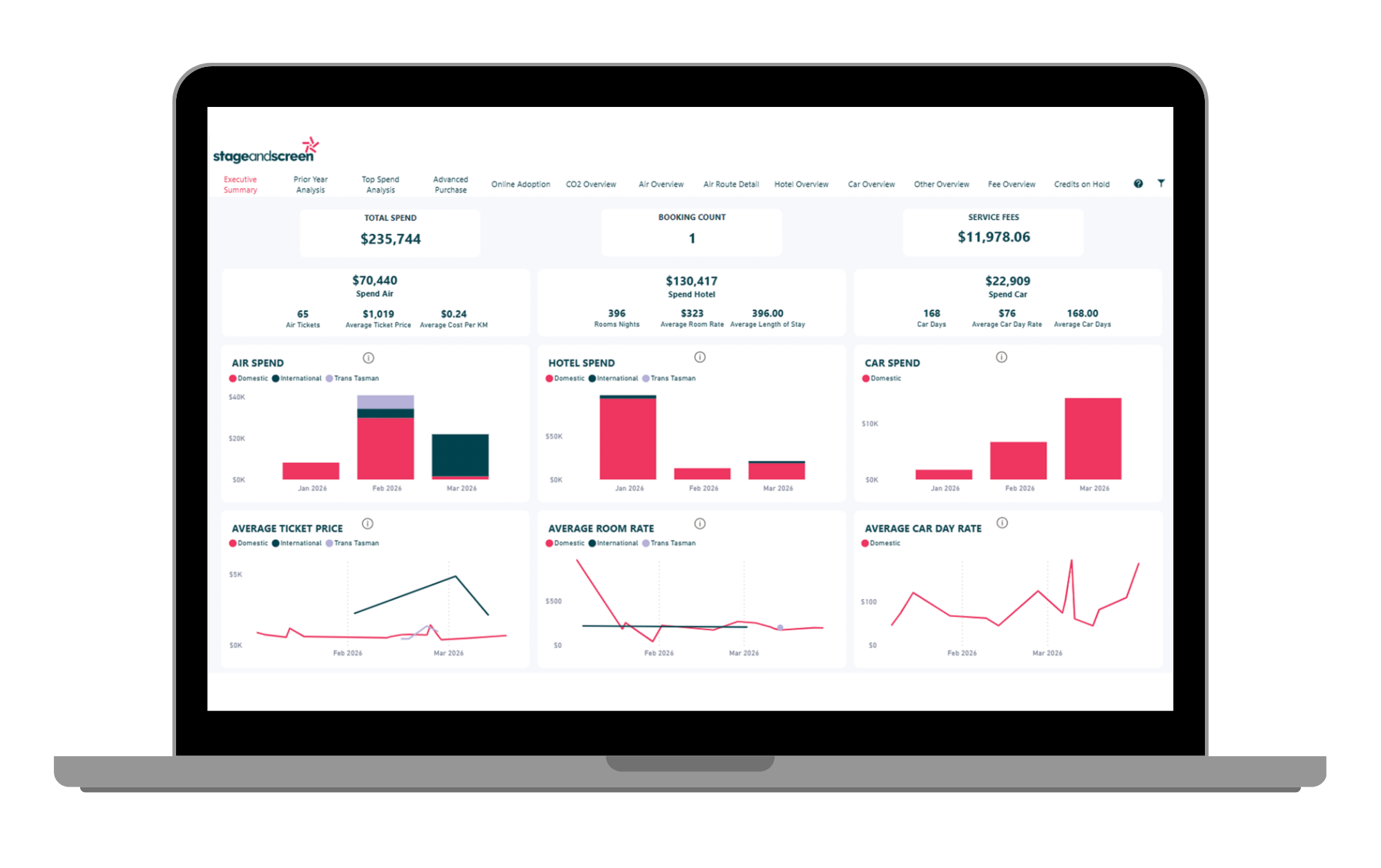 Stage and Screen’s reporting suite brings together every booking — online and offline — to deliver 365-day visibility across your entire program with real-time dashboards available on demand.